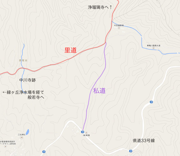 上地図、赤い線の県境の古道は「里道」ですが、紫の線の道路は「私道」だそうです。この私道の持ち主に確認したところ、この道は土地取得以前からある勝手道なので、誰でも通ってかまわないとのことでした。かなり昔に当尾西小の人が作った道なのだそうです。この道の33号線側の入り口には、最近まで「浄瑠璃寺南口」というバスの停留所があり、かつては浄瑠璃寺に向かう多くの観光客がここで降りたと言います。(この地図はGoogle マップで作成した地図に着色したものです。)